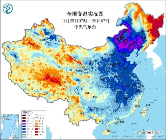 中新網11月26日電 據中央氣象臺網站26日消息,今晨,受今冬首場寒潮天氣影響,內蒙古中東部、東北地區中南部、華北、黃淮、江淮、江南東北部等地降溫6~10℃,內蒙古東南部、河北北部、遼寧北部和西部降幅達12℃以上;今晨5時,氣溫0℃線位于陜西南部至河南北部、山東中部一帶。