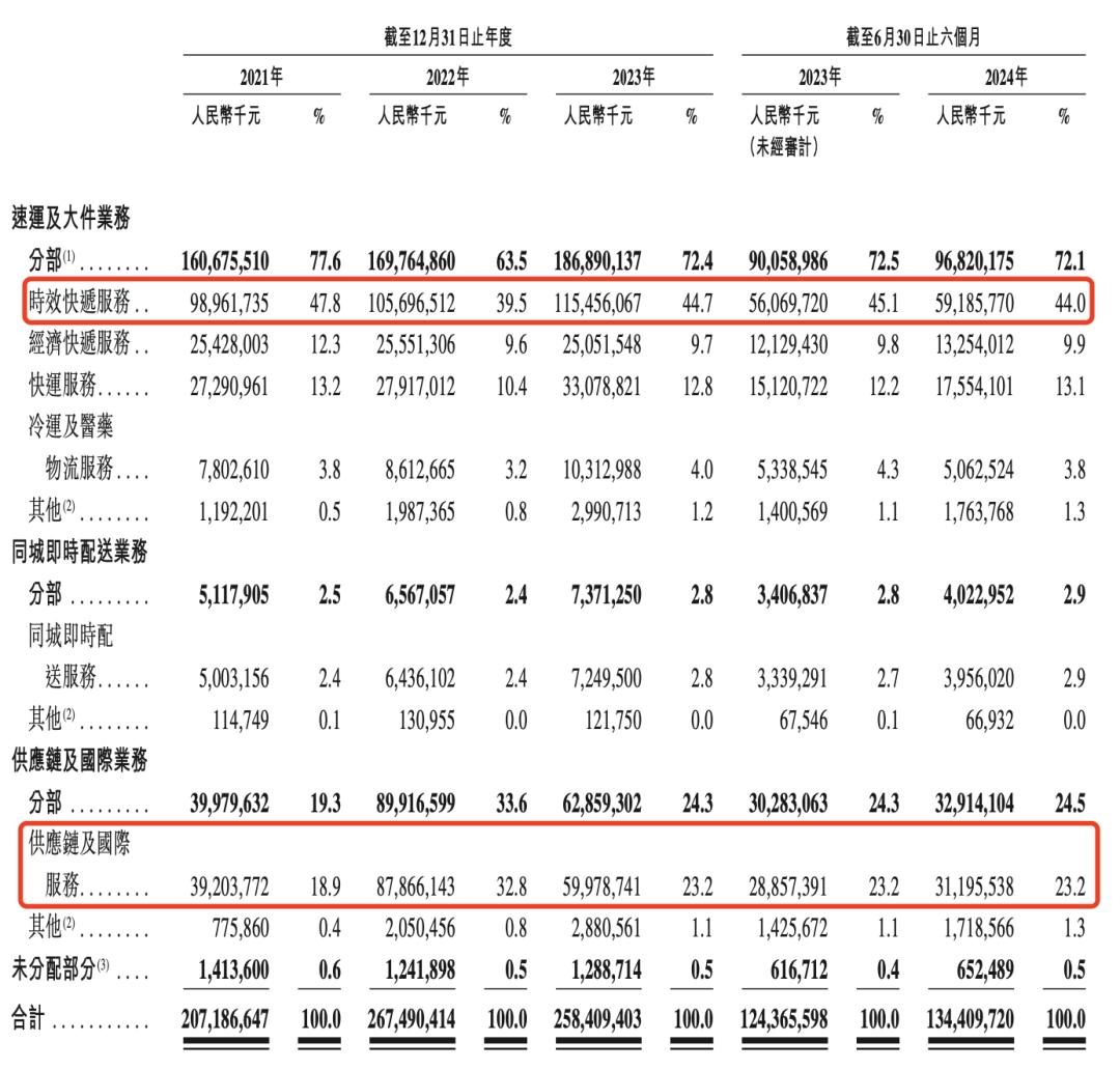 根據(jù)招股書顯示,順豐的業(yè)務分為速運及大件業(yè)務、同城即時配送業(yè)務、供應鏈及國際業(yè)務三個部分。其中,時效快遞還是主營業(yè)務,帶動速運板塊成為公司的支柱業(yè)務,這一業(yè)務從2021年到2023年都在穩(wěn)定增長。