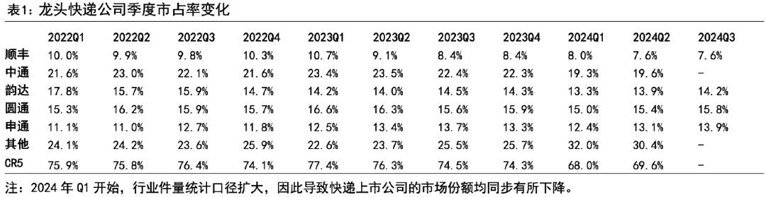 同時,“時效快遞”屬于“小而美”的業(yè)務,其他快遞都與電商平臺進行綁定,時效雖慢但勝在量大。根據(jù)國信證券的一份報告顯示,順豐的市場份額一直低于三通一達,且從2023年Q1開始逐漸降低。