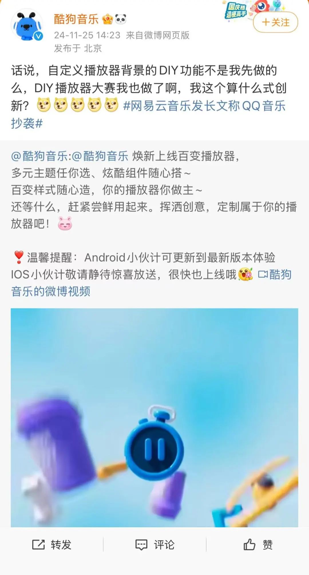 酷狗音樂在其官方微博上表示,自定義播放器背景的DIY功能,并不是網易云音樂首創,而是酷狗音樂早在幾年前就已經推出的功能。酷狗音樂還提到,他們曾經舉辦過DIY播放器大賽。