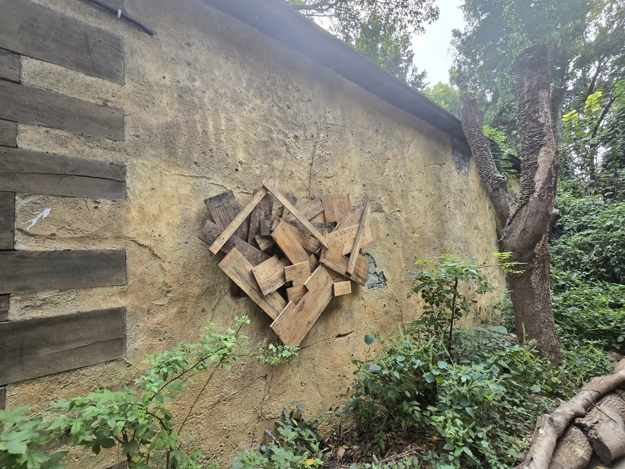在本土區,不僅有狗獾、貉、獐子這些動物,還有一些不那么引人注目的小動物們,同樣以這片土地為家,是紅山里的小主人。最近,水獺們更換了更加保暖的新巢箱,而舊巢箱也沒有被丟棄,工作人員利用舊巢箱拆掉的木板,在開闊的墻面上做了一個“壁虎之家”。據介紹,在這個裝置里,工作人員特意將多層的木板與木板之間、木板與墻面之間留一些縫隙,這些小空隙形成了一個個微小而安全的藏身之所,吸引著那些喜歡縫隙的小動物們前來安家落戶。
