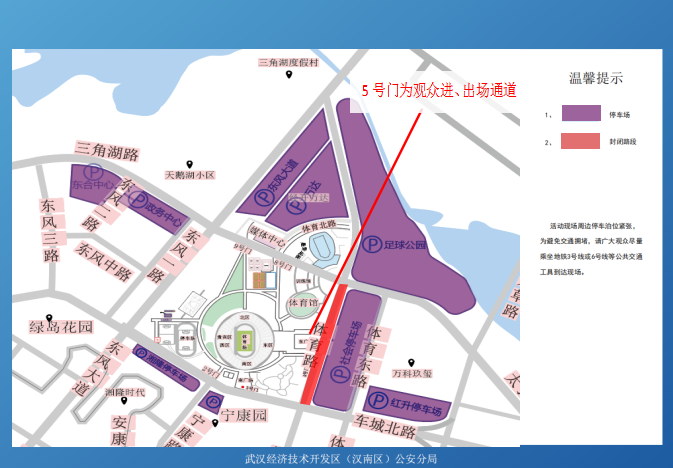 (3)乘坐202路、205路、208路、271路、325路、335路/K335路、385路、579路、585路、597路、654路、769路公交至東風(fēng)大道三角湖路站,沿東風(fēng)大道—太子湖路—體育路線路前往體育中心5號(hào)門觀眾出入口。