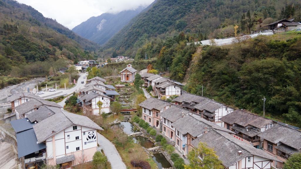 2022年11月17日拍攝的位于四川寶興縣蜂桶寨鄉(xiāng)的熊貓新村(無(wú)人機(jī)照片)。新華社記者胥冰潔 攝