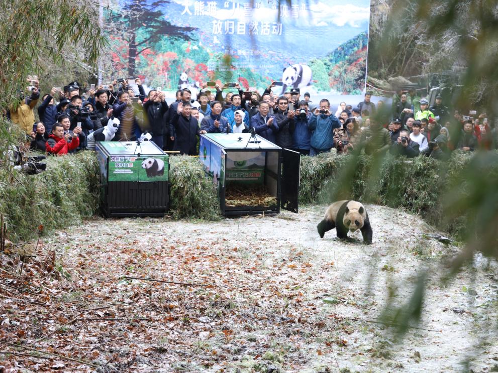 2017年11月23日,大熊貓“映雪”在四川雅安栗子坪國(guó)家級(jí)自然保護(hù)區(qū)回歸大自然。(韓毅 攝)