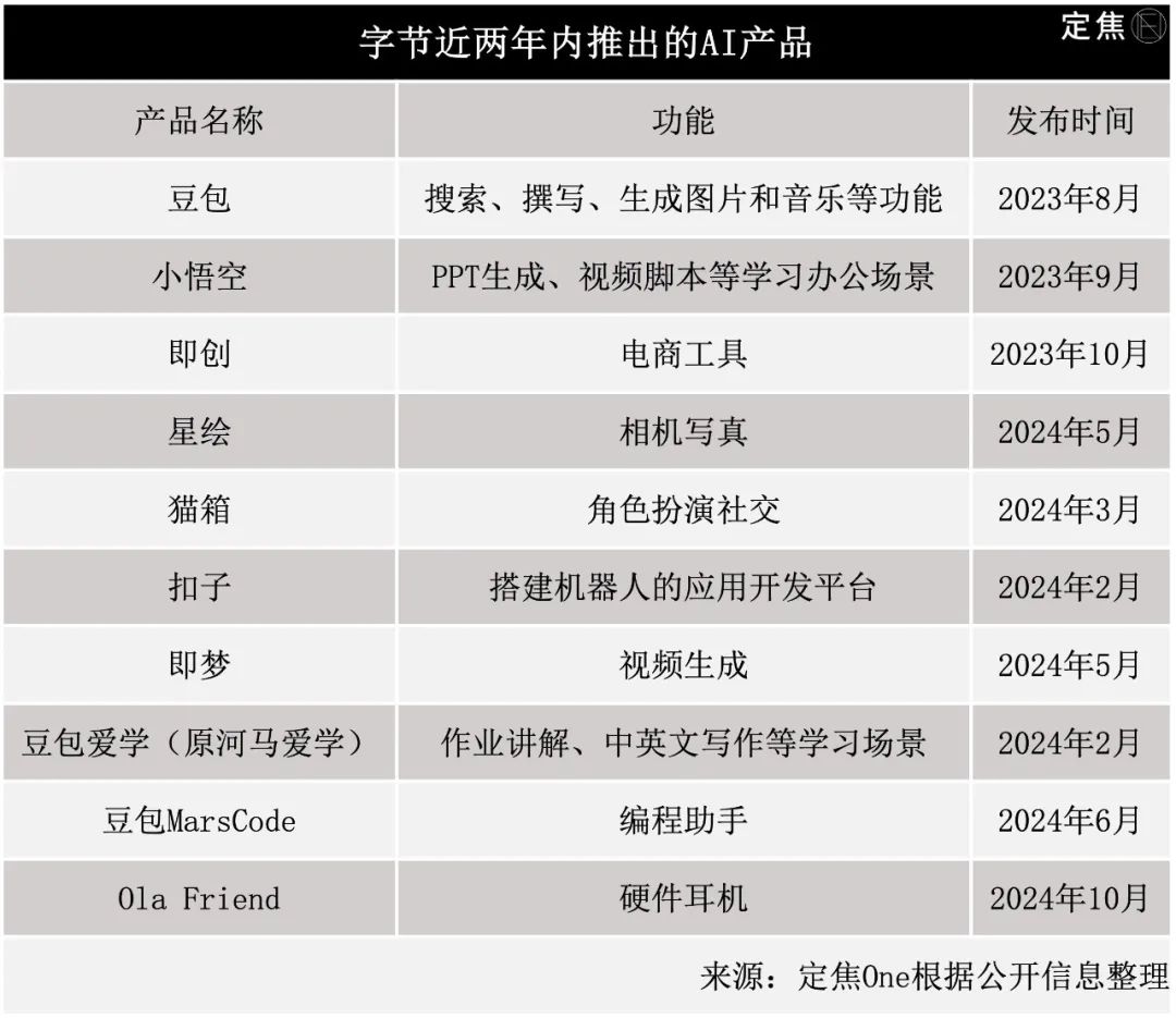 資深AI領域從業者、《數據增長模型》《AI賦能》作者連詩路分析,字節做AI的思路和它一貫做其他領域的思路一樣,即多條線、多產品布局然后進行賽馬。且相比其他大廠,字節做的toC類AI產品較多。
