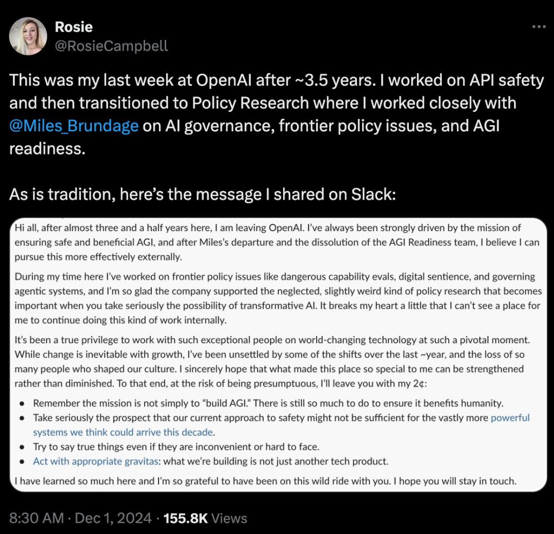她在X上說到“這是我在OpenAI工作約3.5年后的最后一周。我先是從事API安全工作,然后轉到了政策研究部門,在那里我與@Miles_Brundage 緊密合作,共同研究人工智能治理、前沿政策問題以及通用人工智能(AGI)的準備情況。”