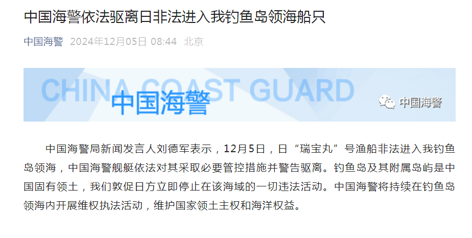 中國海警局新聞發(fā)言人劉德軍表示,12月5日,日“瑞寶丸”號漁船非法進入我釣魚島領(lǐng)海,中國海警艦艇依法對其采取必要管控措施并警告驅(qū)離。釣魚島及其附屬島嶼是中國固有領(lǐng)土,我們敦促日方立即停止在該海域的一切違法活動。中國海警將持續(xù)在釣魚島領(lǐng)海內(nèi)開展維權(quán)執(zhí)法活動,維護國家領(lǐng)土主權(quán)和海洋權(quán)益。