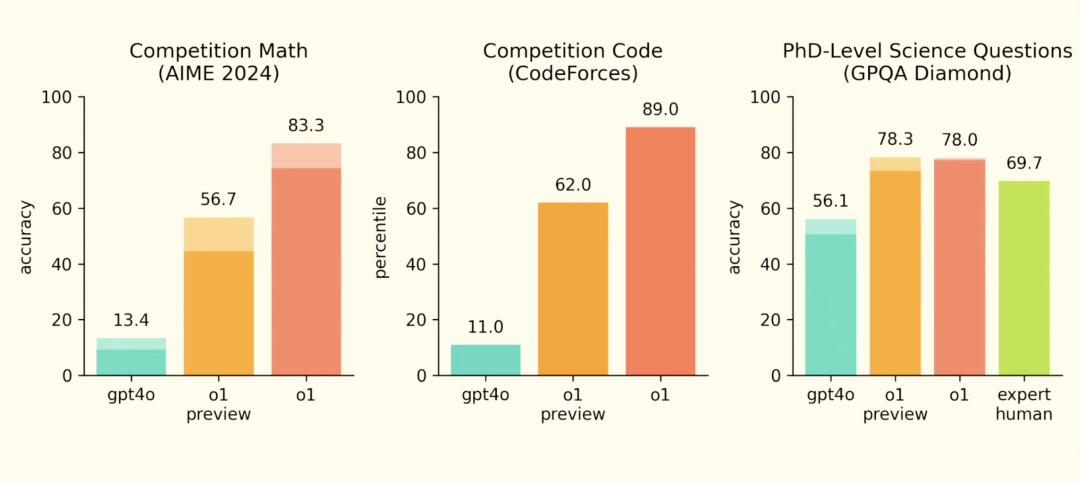 發(fā)布會(huì)上,Sam Altman 再次以模型解決數(shù)學(xué)競賽題、編程競賽題和博士級(jí)別的科學(xué)問題的能力,來展現(xiàn)新模型的水平。