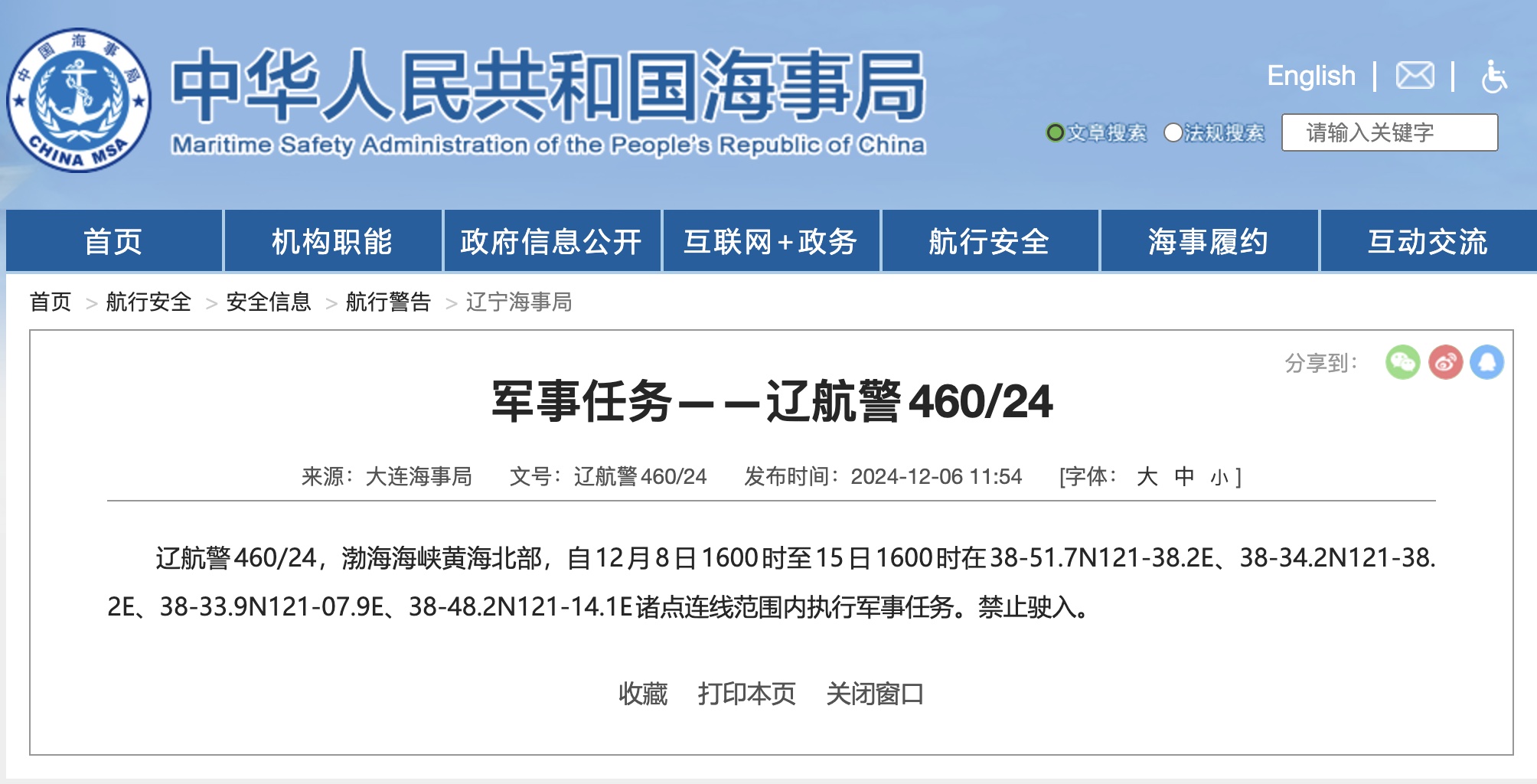 大連海事局發(fā)布航行警告,12月8日16時至15日16時,渤海海峽黃海北部部分海域執(zhí)行軍事任務(wù),禁止駛?cè)搿?span style="display:none">acM知多少教育網(wǎng)-記錄每日最新科研教育資訊