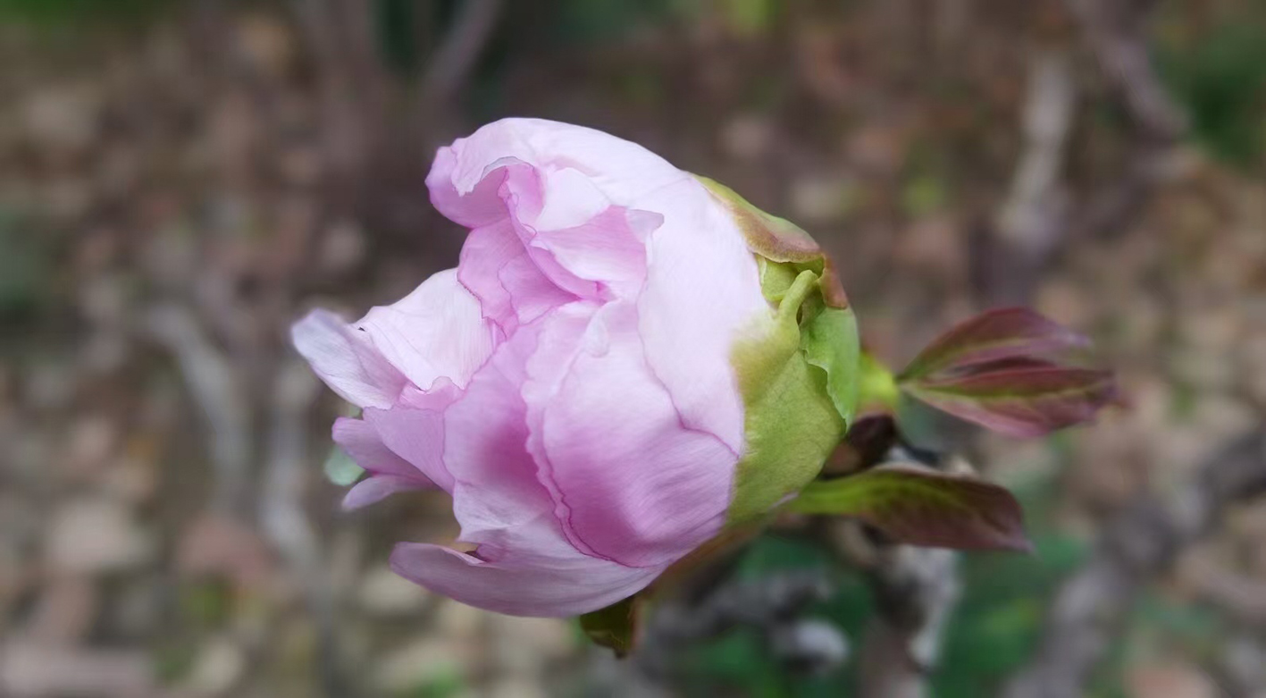 從吳有海自現場發來的視頻、照片,記者看到了那朵令他贊不絕口“堅強牡丹”。一株落葉的牡丹樹,不足一米高,虬枝盤曲,其中一根樹枝上,結了一個粉紅色的花骨朵,絲絹般的花瓣微微散開,五六片紅綠色的小葉子將其環抱。