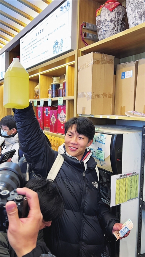 天還沒亮,寒意料峭,老字號元大昌各門店前就排起了長隊。在元大昌宮巷店,記者看到,現場早已人聲鼎沸,蜿蜒的隊伍已經繞到珍珠弄。隊伍中,不少老蘇州帶著瓶子,趕著第一班地鐵、公交前來零拷冬釀酒。隊伍中不僅有老蘇州,還有不少年輕人,甚至周邊城市如無錫、上海也有人慕名而來。隊伍中年輕人占了不小的比例,甚至有人是連夜趕來排隊的。來自昆山硅湖職業技術學院的葉貴華和兩名同學,昨晚九點半就已到元大昌宮巷店,成功拿下001至003號碼牌,他們的臉頰被凍得微微泛紅,呼出的白氣氤氳在空氣中,可眼里滿是興奮的光,毫無倦意。葉貴華告訴記者,他從小就在蘇州長大,去年也來排隊買冬釀酒,覺得味甜好喝。