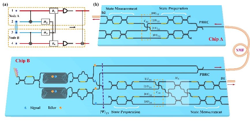 構建大規模量子網絡的關鍵在于實現高集成度、可擴展的量子節點,以及節點間高保真度的量子互聯。光量子集成芯片是實現此網絡極具前景的平臺。在此網絡中,不同節點量子比特間的量子門操作至關重要,而最具挑戰性的便是實現高保真的CNOT門隱形傳輸以糾纏遠程量子比特,這是分布式量子計算的核心步驟。其實現過程極為復雜:需在兩個量子節點間共享糾纏光子對,并在每個節點內執行高精度、復雜的片上線性光學量子操作,對器件性能要求極高。