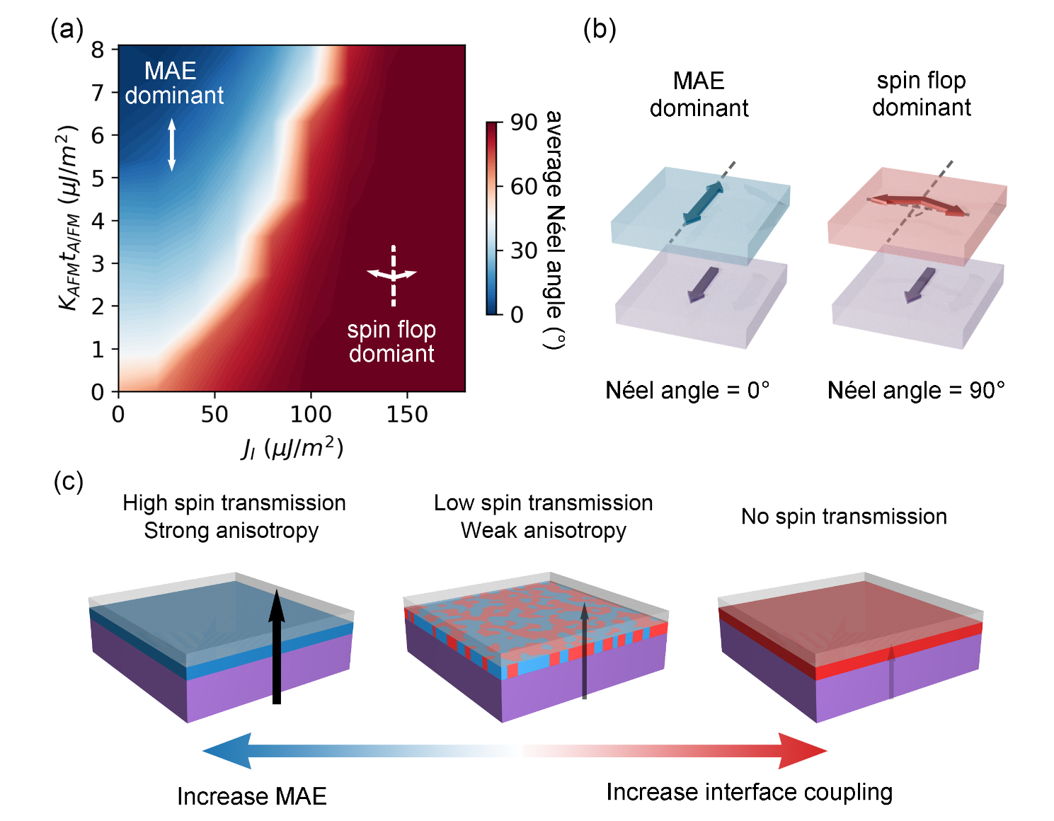 研究團(tuán)隊(duì)進(jìn)一步結(jié)合軟X射線(xiàn)磁線(xiàn)性二色譜(XMLD),揭示了界面耦合強(qiáng)度與反鐵磁層的磁晶各向異性競(jìng)爭(zhēng)驅(qū)動(dòng)LaFeO3的奈爾矢量重定向,并通過(guò)微磁模擬揭示了磁振子輸運(yùn)特性轉(zhuǎn)變的微觀物理機(jī)制(圖5)。研究結(jié)果揭示了界面對(duì)異質(zhì)結(jié)中磁振子輸運(yùn)的關(guān)鍵影響,為發(fā)展反鐵磁磁子器件提供了新的理論基礎(chǔ)與設(shè)計(jì)思路。