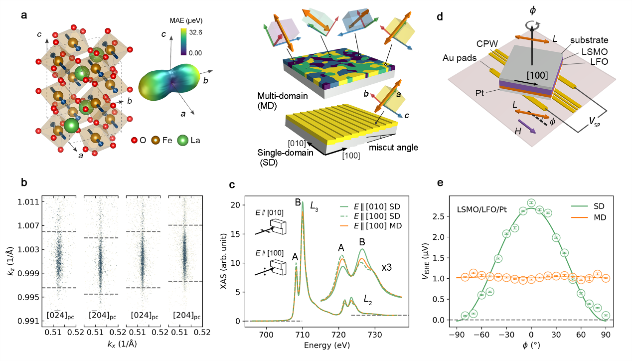 研究團(tuán)隊(duì)基于具有強(qiáng)自旋-晶格耦合的反鐵磁氧化物鐵酸鑭(LaFeO?),通過(guò)精確調(diào)控晶體對(duì)稱(chēng)性和襯底應(yīng)變,成功獲得了具有單結(jié)構(gòu)疇和反鐵磁疇的鐵酸鑭薄膜,實(shí)現(xiàn)了穩(wěn)定、方向唯一的奈爾矢量。該材料能夠高效地傳輸自旋極化與奈爾矢量平行的磁振子流,并完全阻斷自旋極化與奈爾矢量垂直的磁振子流,表現(xiàn)出大的磁振子傳輸“開(kāi)-關(guān)”比(圖2)。