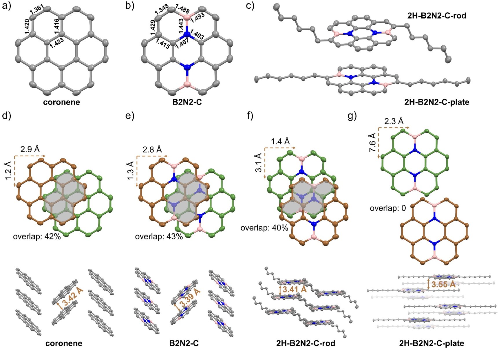 由于等電子特性,B2N2-C具有與蔻相似的平面幾何構型和魚骨狀排列(圖2),π-π堆積距離從3.42?縮短至3.39?,表明B-N偶極-偶極相互作用增強了π堆積效應。而烷基鏈取代的2H-B2N2-C產生了兩種穩定的結晶相,分別是以π-π堆積為主導的棒狀相和以C-H···π堆積為主導的片狀相。三種硼氮雜蔻分子的晶體結構均表現出平行的B-N偶極排列,表明B-N誘導分子有序組裝的特性。計算表明,B2N2-C相比蔻的π-π相互作用能提升了1.27kcal/mol,體現了B-N偶極所提供的額外相互作用。溶液光譜測試表明,隨濃度升高,硼氮雜蔻系列分子均會表現出蔻所沒有的激基締合物發射,進一步證明了B-N偶極誘導分子形成了有序的組裝體,表明B-N偶極可為調控分子的聚集態發射提供新途徑。粉末紫外-可見-近紅外漫反射光譜表明,B-N偶極使帶隙顯著變窄了0.41eV,而隨著烷基鏈增加,帶隙逐步增大。并結合理論計算結果表明,B2N2-C具有收窄的固態帶隙和增強的電子耦合,在未來有機電子材料方面具有廣泛的應用前景。基于H-B2N2-C旋涂制備的薄膜,表現出了2.8×10?4 cm2V?1s?1的空穴遷移率。