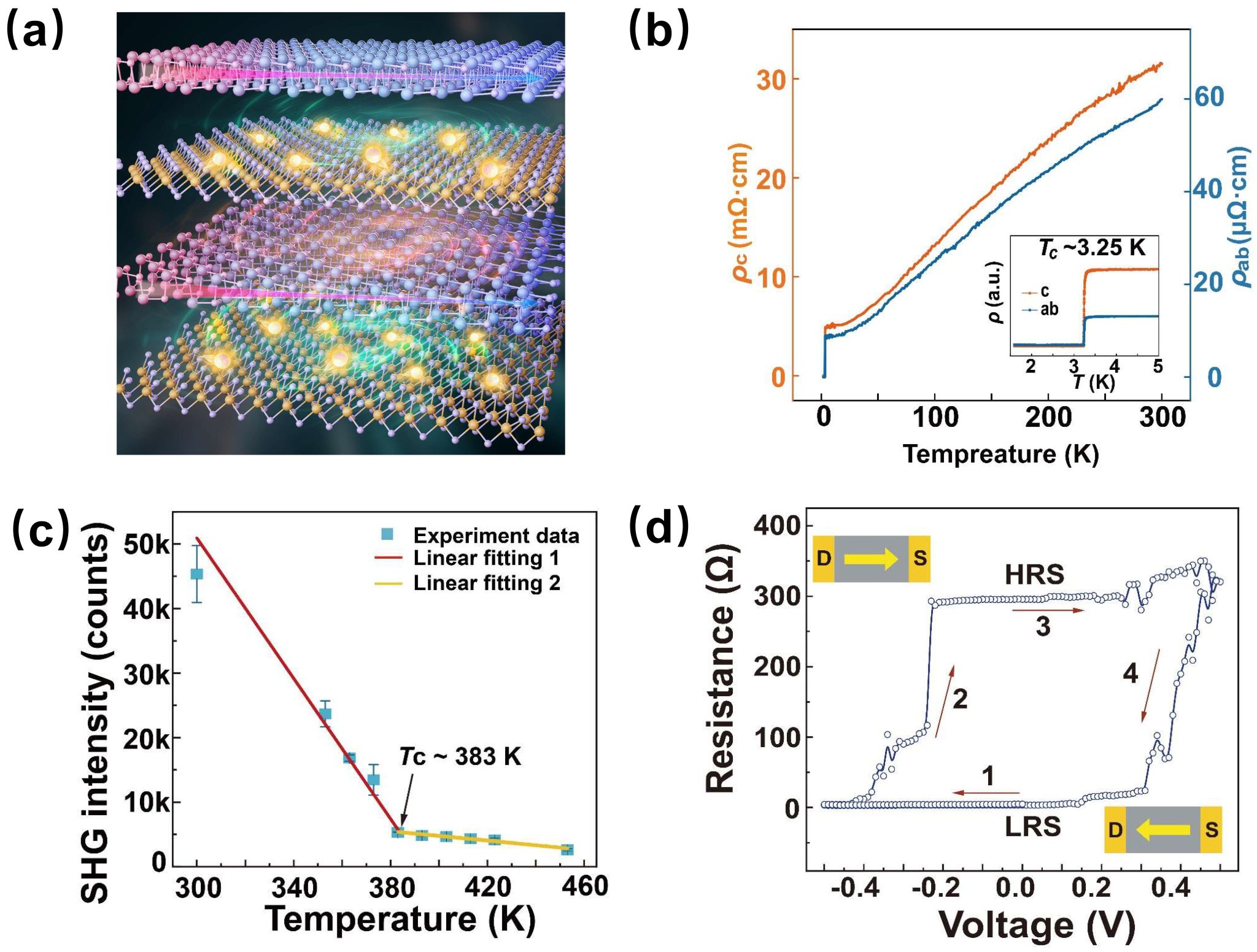 圖:(a)范德華超晶格(SnSe)1.16(NbSe2)示意圖,展示了鐵電層和金屬層的交替堆疊結構;(b)該晶體面內方向和面外方向的變溫電輸運,展示了良好的金屬性和超導電性;(c)溫度依賴的非線性光學二次諧波效應和鐵電居里溫度;(d)鐵電憶阻效應,高低電阻態被小電壓脈沖所切換。