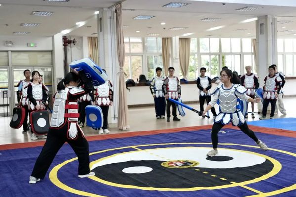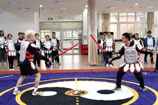 幾聲清脆的兵器交擊聲響起,兩名學生身著護甲,手持短兵,正在一場攻防中你來我往。這不是古裝劇拍攝,而是自2024年起新開設的《武術兵道》課程。