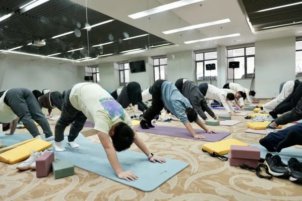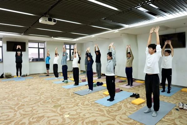 課程從呼吸調控、基礎站姿入手,逐步推進至“拜日式”串聯及各類前屈、后伸與扭轉體式。每節課以調息靜心開始,以“休息術”收尾,其間輔以清脆的引磬喚醒學生意識,形成“動——靜——醒”的完整閉環。