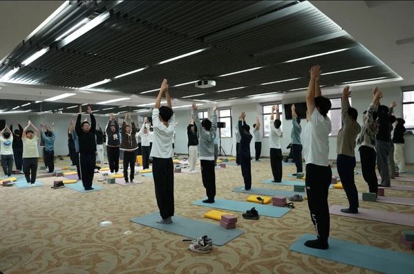 “注意感受呼吸的節奏,讓氣息深入到腹部。”輕敲引磬,清脆的聲音在瑜伽教室里回蕩。二十余名學生平躺在墊子上,閉目調息,仿佛與外界的喧囂隔絕。