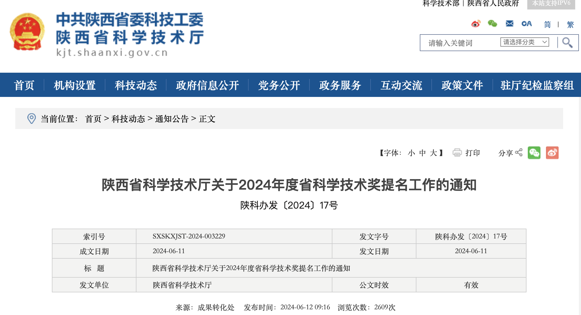 陜西省科學技術廳關于2024年度省科學技術獎提名工作的通知