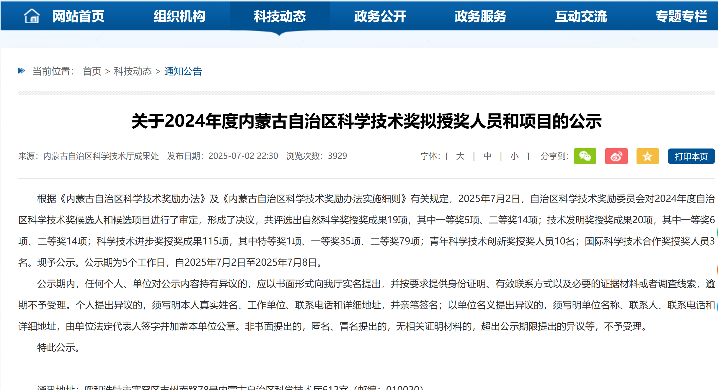 根據(jù)《內(nèi)蒙古自治區(qū)科學(xué)技術(shù)獎(jiǎng)勵(lì)辦法》及《內(nèi)蒙古自治區(qū)科學(xué)技術(shù)獎(jiǎng)勵(lì)辦法實(shí)施細(xì)則》有關(guān)規(guī)定,2025年7月2日,自治區(qū)科學(xué)技術(shù)獎(jiǎng)勵(lì)委員會(huì)對(duì)2024年度自治區(qū)科學(xué)技術(shù)獎(jiǎng)候選人和候選項(xiàng)目進(jìn)行了審定,形成了決議,共評(píng)選出自然科學(xué)獎(jiǎng)授獎(jiǎng)成果19項(xiàng),其中一等獎(jiǎng)5項(xiàng)、二等獎(jiǎng)14項(xiàng);技術(shù)發(fā)明獎(jiǎng)授獎(jiǎng)成果20項(xiàng),其中一等獎(jiǎng)6項(xiàng)、二等獎(jiǎng)14項(xiàng);科學(xué)技術(shù)進(jìn)步獎(jiǎng)授獎(jiǎng)成果115項(xiàng),其中特等獎(jiǎng)1項(xiàng)、一等獎(jiǎng)35項(xiàng)、二等獎(jiǎng)79項(xiàng);青年科學(xué)技術(shù)創(chuàng)新獎(jiǎng)授獎(jiǎng)人員10名;國(guó)際科學(xué)技術(shù)合作獎(jiǎng)授獎(jiǎng)人員3名。現(xiàn)予公示。公示期為5個(gè)工作日,自2025年7月2日至2025年7月8日。