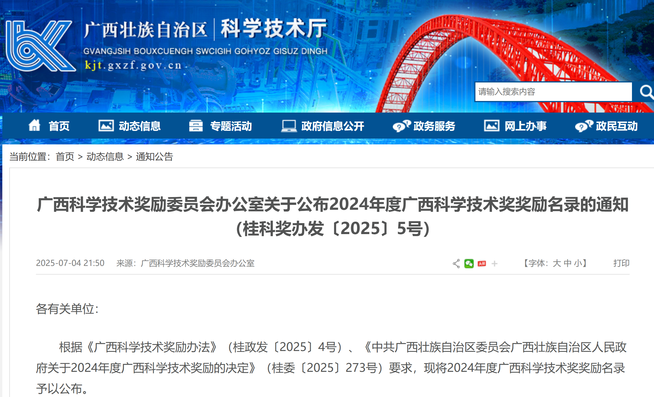 根據(jù)《廣西科學(xué)技術(shù)獎(jiǎng)勵(lì)辦法》(桂政發(fā)〔2025〕4號(hào))、《中共廣西壯族自治區(qū)委員會(huì)廣西壯族自治區(qū)人民政府關(guān)于2024年度廣西科學(xué)技術(shù)獎(jiǎng)勵(lì)的決定》(桂委〔2025〕273號(hào))要求,現(xiàn)將2024年度廣西科學(xué)技術(shù)獎(jiǎng)獎(jiǎng)勵(lì)名錄予以公布。