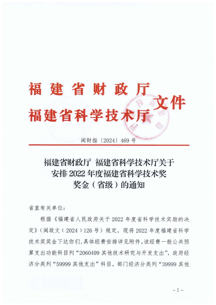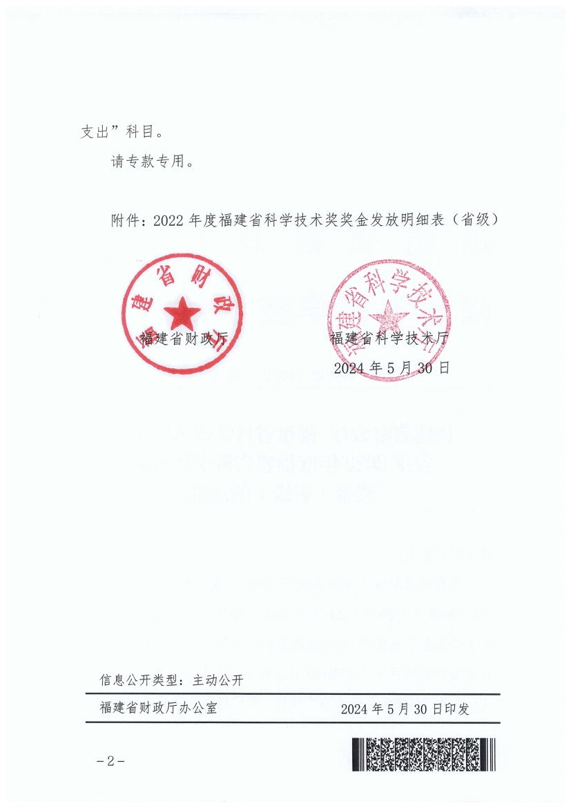 福建省財政廳 福建省科學技術廳關于安排2022年度福建省科學技術獎獎金(省級)的通知