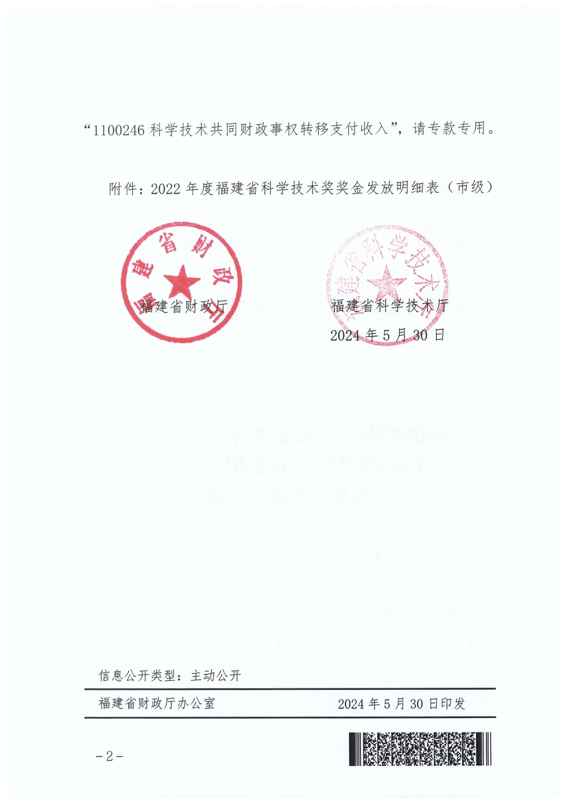 福建省財政廳 福建省科學技術廳關于下達2022年度福建省科學技術獎獎金(市級)的通知