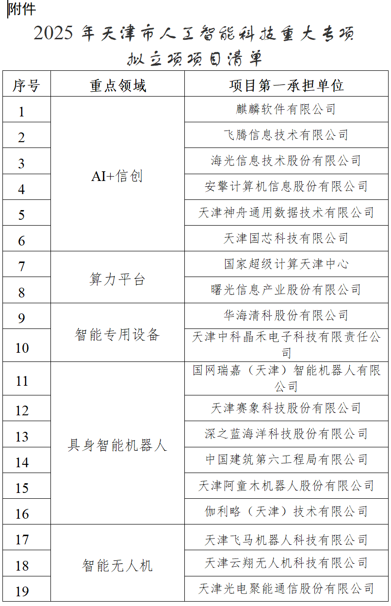 經專家評審等程序,市科技局局長辦公會審議通過了2025年天津市人工智能科技重大專項擬立項項目,現予以公示。