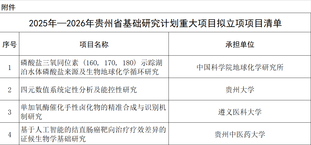 2025年—2026年貴州省基礎研究計劃重大項目擬立項項目公示